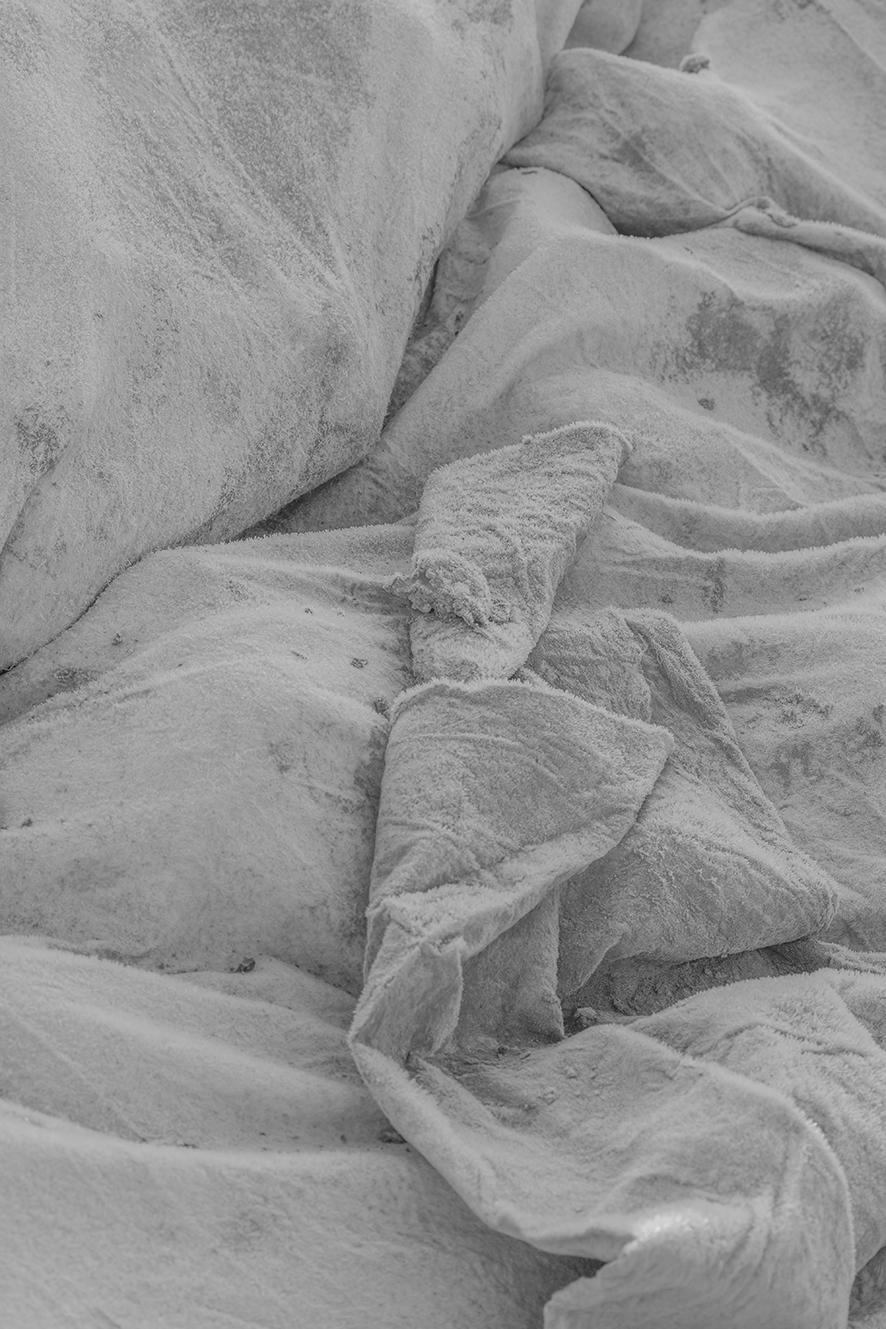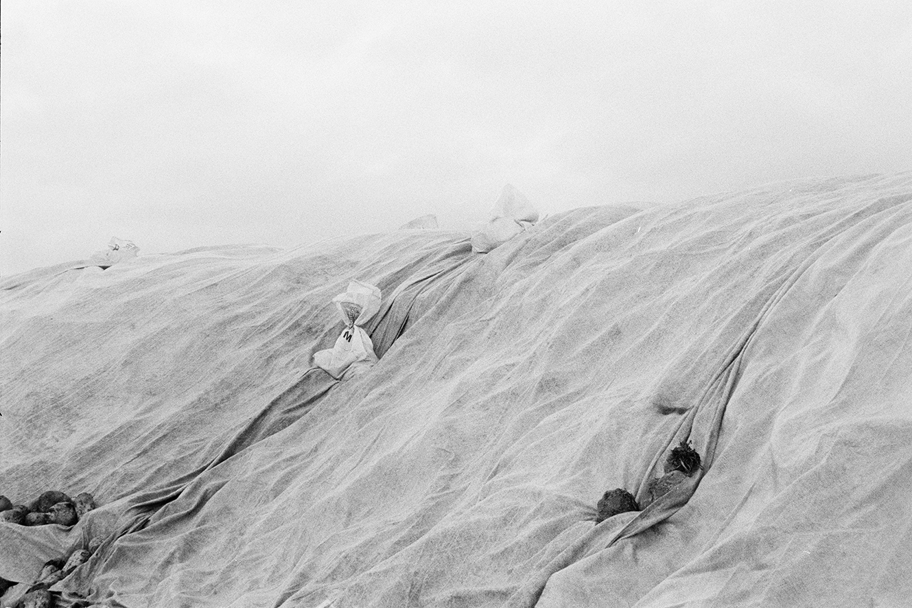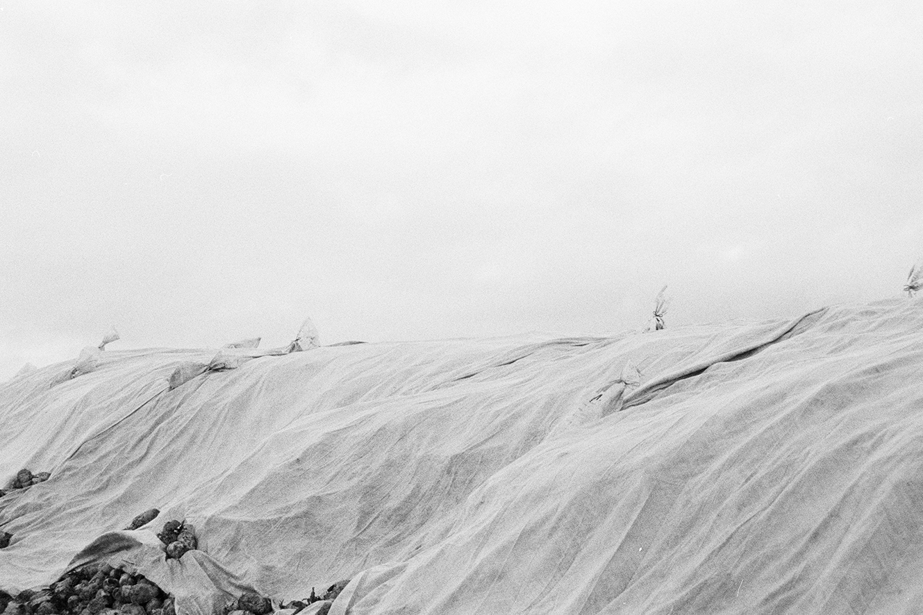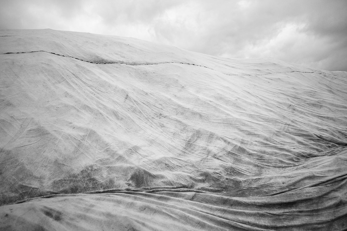 Présents au bord des routes, ces amas de récoltes se couvrent, se protègent, se transforment en micro-paysages cycliques. Drapées, plissées ou tendues, les toiles font naître des reliefs mouvants : la surface agricole se dédouble, devient montagne, draperie ou strate rocheuse, comme si les plis ouvraient soudain une géologie inédite.